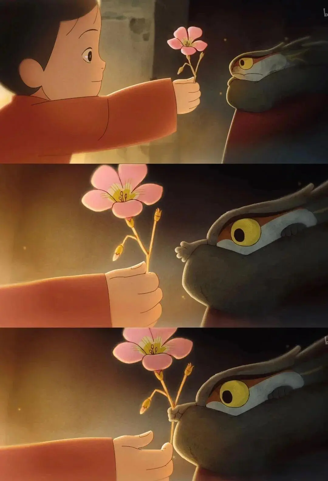 很喜欢导演“没有把这些村民描述成愚民”这一设定,大多数故事里,百姓的无知和愚昧会是小蛇们被认可的最大阻碍,可在《如何成为三条龙》里,村民们会把小蛇们做的事情看在眼里,通过孩童视角,从一开始被小蛇们吓哭,到最后送小蛇们小花,她知道它们是善良的小蛇,愿意把美好的奖励给这些正在努力付出的“神”。