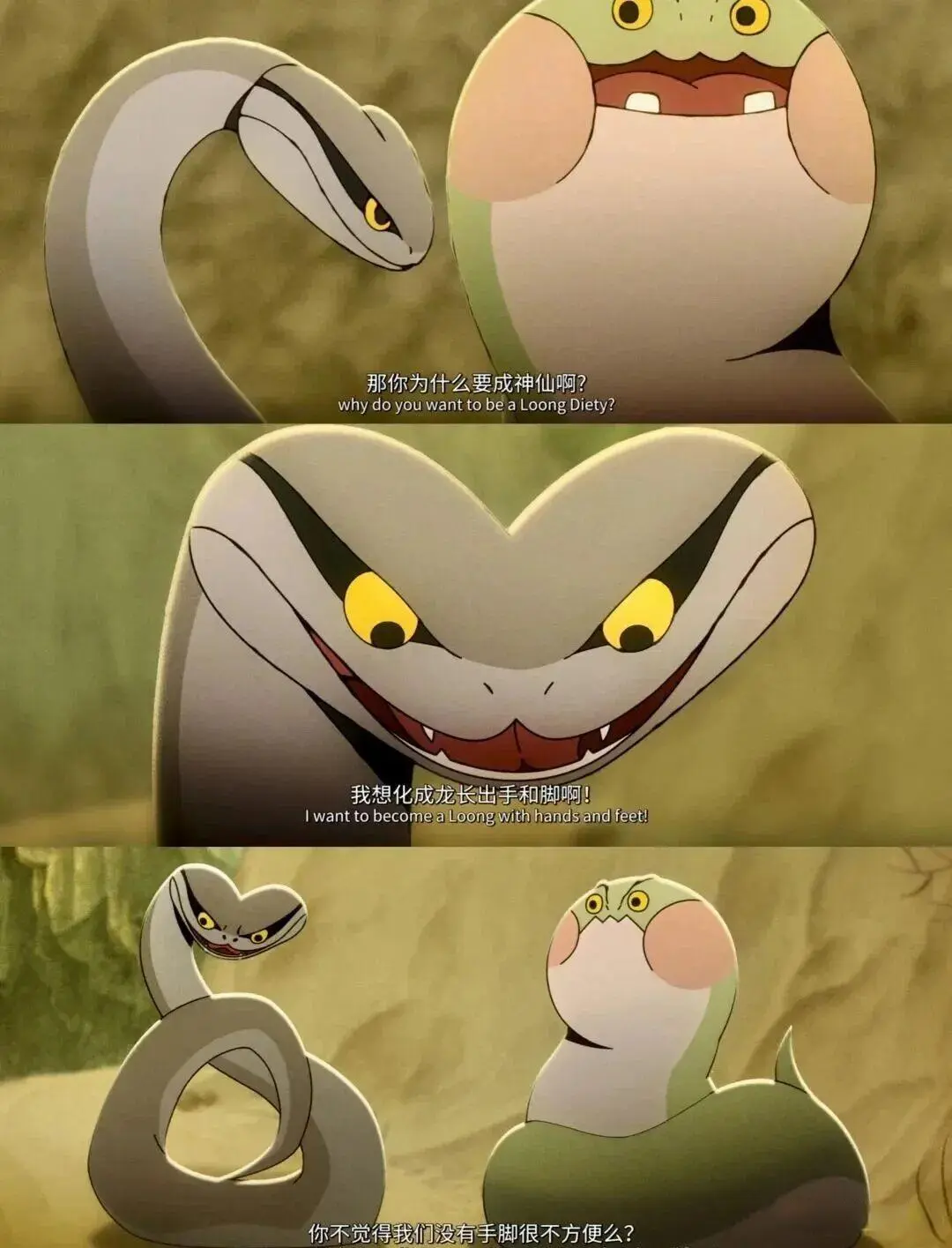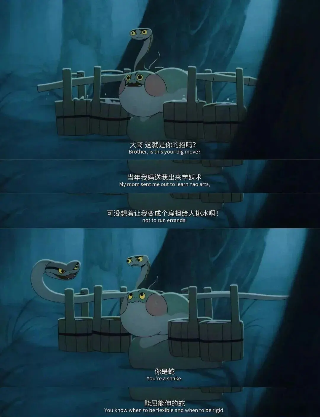 其中一条小蛇心有不甘,说:“当年我妈送我出来学妖术,可没想着让我变成个扁担给人挑水。”我听到这话时瞬间破防,太扎心了!